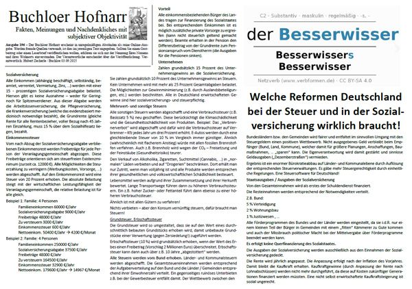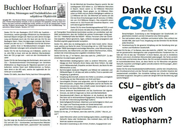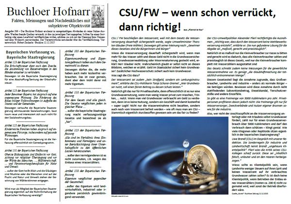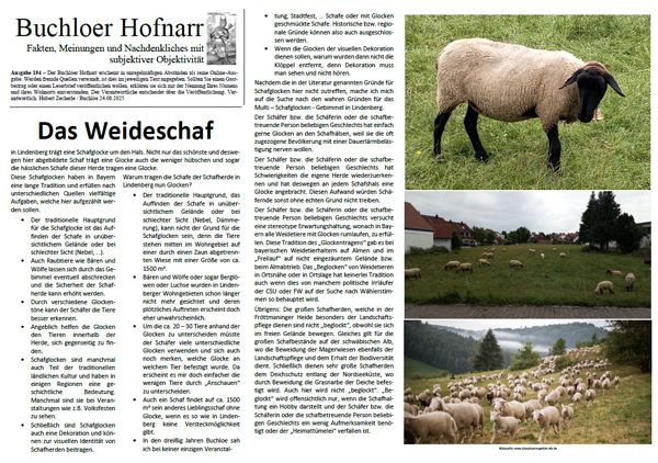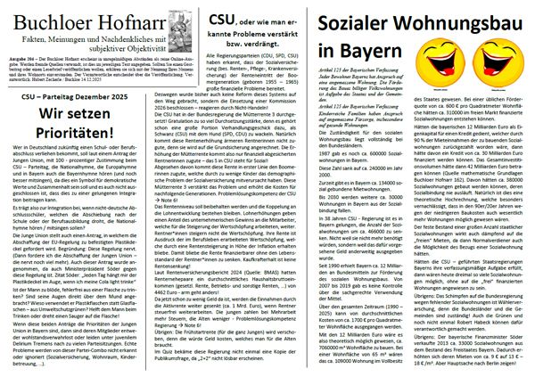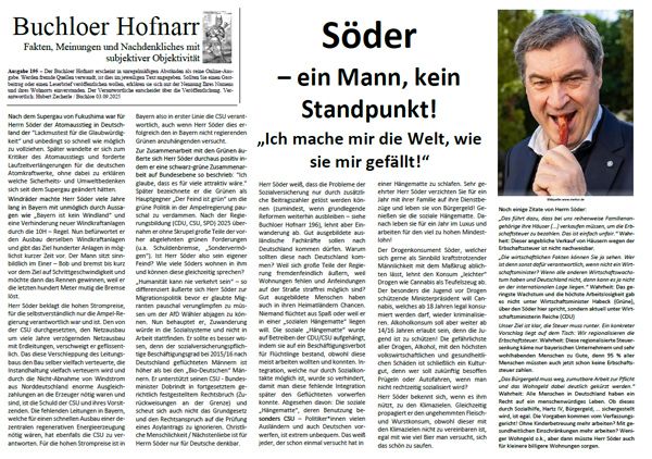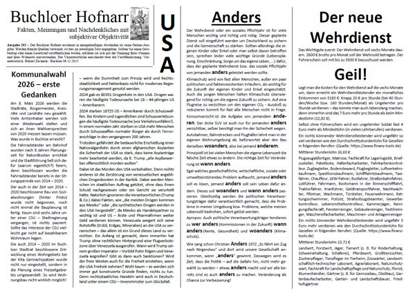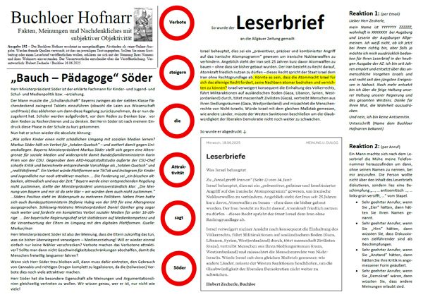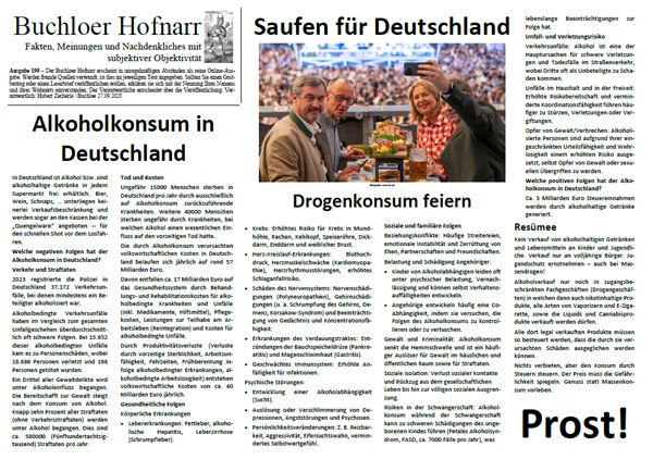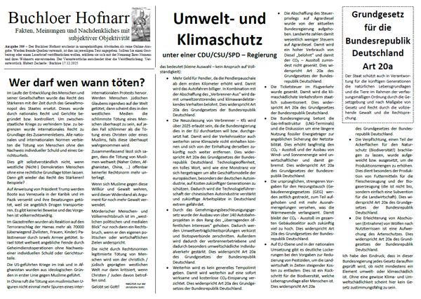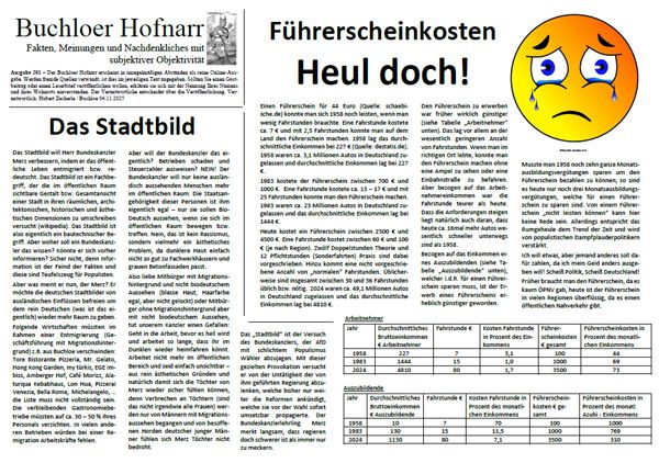 | Der Buchloer Hofnarr erscheint in unregelmäßigen Abständen als reine Online-Ausgabe. Werden fremde Quellen verwandt, ist dies im jeweiligen Text angegeben. Sollten Sie einen Gastbeitrag oder einen Leserbrief veröffentlichen wollen, erklären sie sich mit der Nennung Ihres Namens und ihres Wohnorts einverstanden. Der Verantwortliche entscheidet über die Veröffentlichung. | |
